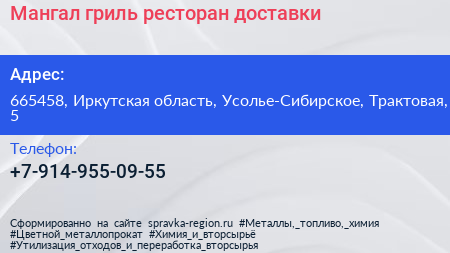 Мангал-гриль, ресторан доставки по адресу 665458, Иркутская область, Усолье-Сибирское, Трактовая, 5 в дальнейшем Организация, размещена в следующих категориях: