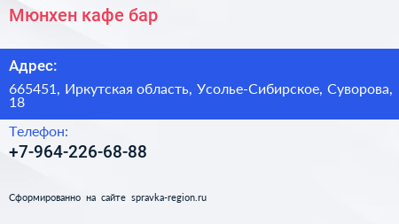 Мюнхен, кафе-бар по адресу 665451, Иркутская область, Усолье-Сибирское, Суворова, 18 в дальнейшем Организация, размещена в следующих категориях: