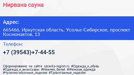 Нирвана, сауна по адресу 665466, Иркутская область, Усолье-Сибирское, проспект Космонавтов, 13 в дальнейшем Организация, размещена в следующих категориях: