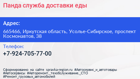 Панда, служба доставки еды по адресу 665466, Иркутская область, Усолье-Сибирское, проспект Космонавтов, 38 в дальнейшем Организация, размещена в следующих категориях: