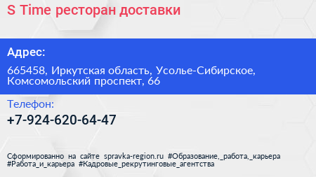 S-Time, ресторан доставки по адресу 665458, Иркутская область, Усолье-Сибирское, Комсомольский проспект, 66 в дальнейшем Организация, размещена в следующих категориях:
