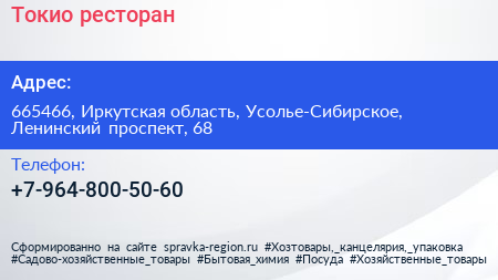 Токио, ресторан по адресу 665466, Иркутская область, Усолье-Сибирское, Ленинский проспект, 68 в дальнейшем Организация, размещена в следующих категориях: