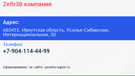 Zefir38, компания по адресу 665451, Иркутская область, Усолье-Сибирское, Интернациональная, 50 в дальнейшем Организация, размещена в следующих категориях: