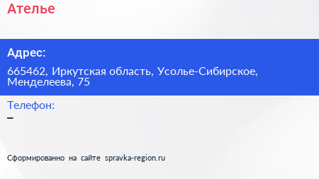 Ателье по адресу 665462, Иркутская область, Усолье-Сибирское, Менделеева, 75 в дальнейшем Организация, размещена в следующих категориях:
