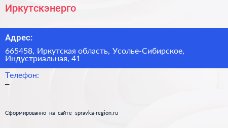 Иркутскэнерго по адресу 665458, Иркутская область, Усолье-Сибирское, Индустриальная, 41 в дальнейшем Организация, размещена в следующих категориях: