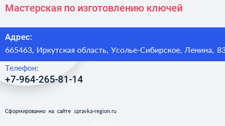 Мастерская по изготовлению ключей по адресу 665463, Иркутская область, Усолье-Сибирское, Ленина, 83 в дальнейшем Организация, размещена в следующих категориях: