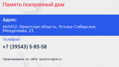 Память, похоронный дом по адресу 665452, Иркутская область, Усолье-Сибирское, Менделеева, 21 в дальнейшем Организация, размещена в следующих категориях:
