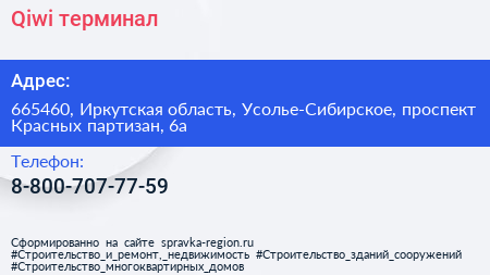 Qiwi, терминал по адресу 665460, Иркутская область, Усолье-Сибирское, проспект Красных партизан, 6а в дальнейшем Организация, размещена в следующих категориях: