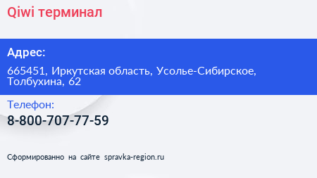 Qiwi, терминал по адресу 665451, Иркутская область, Усолье-Сибирское, Толбухина, 62 в дальнейшем Организация, размещена в следующих категориях: