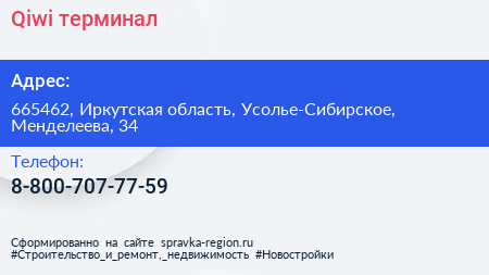 Qiwi, терминал по адресу 665462, Иркутская область, Усолье-Сибирское, Менделеева, 34 в дальнейшем Организация, размещена в следующих категориях: