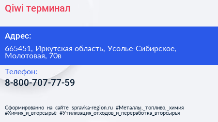 Qiwi, терминал по адресу 665451, Иркутская область, Усолье-Сибирское, Молотовая, 70в в дальнейшем Организация, размещена в следующих категориях: