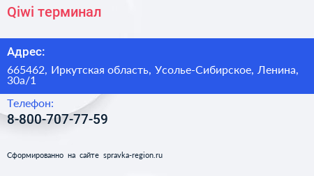 Qiwi, терминал по адресу 665462, Иркутская область, Усолье-Сибирское, Ленина, 30а/1 в дальнейшем Организация, размещена в следующих категориях: