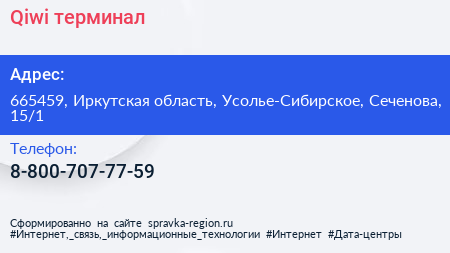 Qiwi, терминал по адресу 665459, Иркутская область, Усолье-Сибирское, Сеченова, 15/1 в дальнейшем Организация, размещена в следующих категориях: