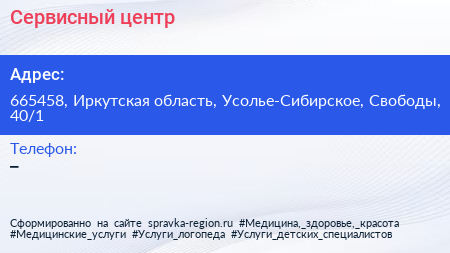 Сервисный центр по адресу 665458, Иркутская область, Усолье-Сибирское, Свободы, 40/1 в дальнейшем Организация, размещена в следующих категориях: