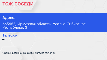 ТСЖ СОСЕДИ по адресу 665462, Иркутская область, Усолье-Сибирское, Республики, 3 в дальнейшем Организация, размещена в следующих категориях: