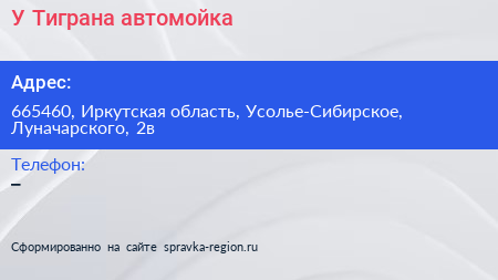 У Тиграна, автомойка по адресу 665460, Иркутская область, Усолье-Сибирское, Луначарского, 2в в дальнейшем Организация, размещена в следующих категориях: