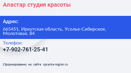 Аластар, студия красоты по адресу 665451, Иркутская область, Усолье-Сибирское, Молотовая, 84 в дальнейшем Организация, размещена в следующих категориях: