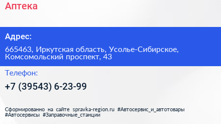 Аптека по адресу 665463, Иркутская область, Усолье-Сибирское, Комсомольский проспект, 43 в дальнейшем Организация, размещена в следующих категориях: