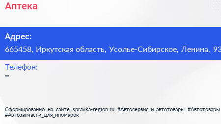 Аптека по адресу 665458, Иркутская область, Усолье-Сибирское, Ленина, 93 в дальнейшем Организация, размещена в следующих категориях: