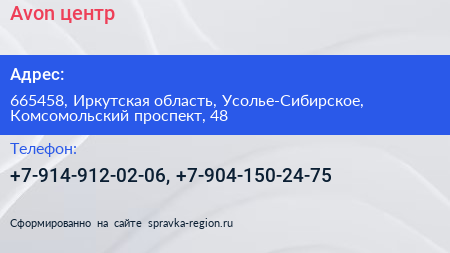 Avon, центр по адресу 665458, Иркутская область, Усолье-Сибирское, Комсомольский проспект, 48 в дальнейшем Организация, размещена в следующих категориях: