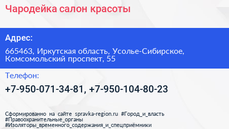 Чародейка, салон красоты по адресу 665463, Иркутская область, Усолье-Сибирское, Комсомольский проспект, 55 в дальнейшем Организация, размещена в следующих категориях: