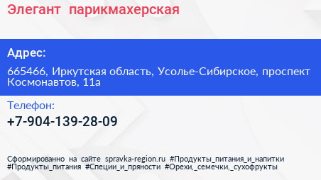 Элегант+, парикмахерская по адресу 665466, Иркутская область, Усолье-Сибирское, проспект Космонавтов, 11а в дальнейшем Организация, размещена в следующих категориях: