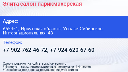 Элита, салон-парикмахерская по адресу 665451, Иркутская область, Усолье-Сибирское, Интернациональная, 48 в дальнейшем Организация, размещена в следующих категориях: