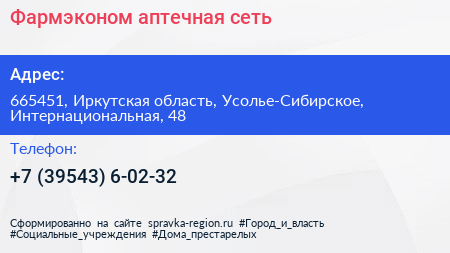 Фармэконом, аптечная сеть по адресу 665451, Иркутская область, Усолье-Сибирское, Интернациональная, 48 в дальнейшем Организация, размещена в следующих категориях: