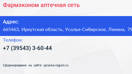 Фармэконом, аптечная сеть по адресу 665463, Иркутская область, Усолье-Сибирское, Ленина, 79 в дальнейшем Организация, размещена в следующих категориях: