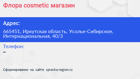 Флора cosmetic, магазин по адресу 665451, Иркутская область, Усолье-Сибирское, Интернациональная, 40/3 в дальнейшем Организация, размещена в следующих категориях: