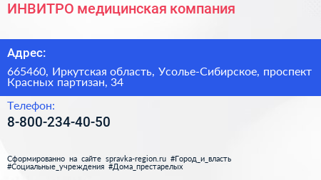 ИНВИТРО, медицинская компания по адресу 665460, Иркутская область, Усолье-Сибирское, проспект Красных партизан, 34 в дальнейшем Организация, размещена в следующих категориях: