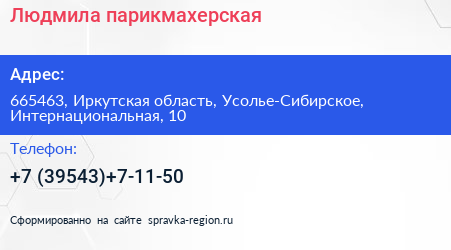 Людмила, парикмахерская по адресу 665463, Иркутская область, Усолье-Сибирское, Интернациональная, 10 в дальнейшем Организация, размещена в следующих категориях: