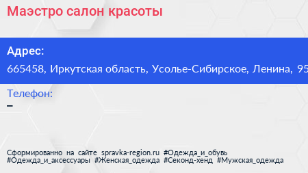 Маэстро, салон красоты по адресу 665458, Иркутская область, Усолье-Сибирское, Ленина, 95 в дальнейшем Организация, размещена в следующих категориях: