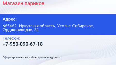 Магазин париков по адресу 665462, Иркутская область, Усолье-Сибирское, Орджоникидзе, 31 в дальнейшем Организация, размещена в следующих категориях:
