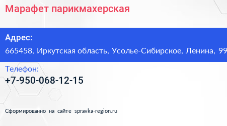 Марафет, парикмахерская по адресу 665458, Иркутская область, Усолье-Сибирское, Ленина, 99 в дальнейшем Организация, размещена в следующих категориях: