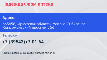 Надежда Фарм, аптека по адресу 665458, Иркутская область, Усолье-Сибирское, Комсомольский проспект, 56 в дальнейшем Организация, размещена в следующих категориях:
