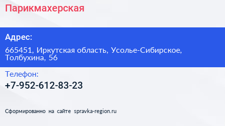 Парикмахерская по адресу 665451, Иркутская область, Усолье-Сибирское, Толбухина, 56 в дальнейшем Организация, размещена в следующих категориях: