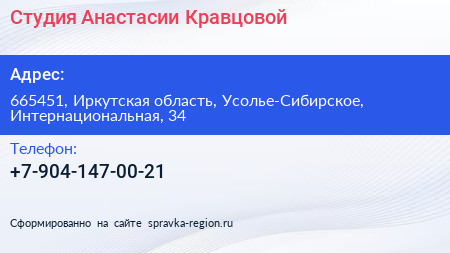 Студия Анастасии Кравцовой по адресу 665451, Иркутская область, Усолье-Сибирское, Интернациональная, 34 в дальнейшем Организация, размещена в следующих категориях: