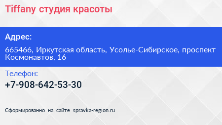 Tiffany, студия красоты по адресу 665466, Иркутская область, Усолье-Сибирское, проспект Космонавтов, 16 в дальнейшем Организация, размещена в следующих категориях: