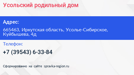 Усольский родильный дом по адресу 665463, Иркутская область, Усолье-Сибирское, Куйбышева, 4д в дальнейшем Организация, размещена в следующих категориях: