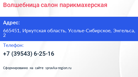 Волшебница, салон-парикмахерская по адресу 665451, Иркутская область, Усолье-Сибирское, Энгельса, 2 в дальнейшем Организация, размещена в следующих категориях: