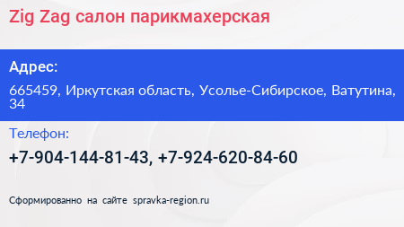 Zig Zag, салон-парикмахерская по адресу 665459, Иркутская область, Усолье-Сибирское, Ватутина, 34 в дальнейшем Организация, размещена в следующих категориях: