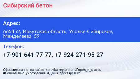 Сибирский бетон по адресу 665452, Иркутская область, Усолье-Сибирское, Менделеева, 59 в дальнейшем Организация, размещена в следующих категориях:
