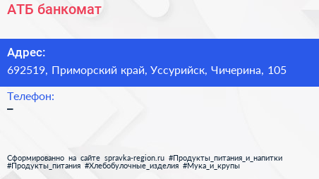АТБ, банкомат по адресу 692519, Приморский край, Уссурийск, Чичерина, 105 в дальнейшем Организация, размещена в следующих категориях: