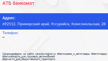 АТБ, банкомат по адресу 692512, Приморский край, Уссурийск, Комсомольская, 28 в дальнейшем Организация, размещена в следующих категориях: