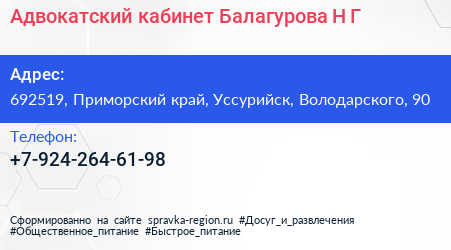 Адвокатский кабинет Балагурова Н.Г. по адресу 692519, Приморский край, Уссурийск, Володарского, 90 в дальнейшем Организация, размещена в следующих категориях: