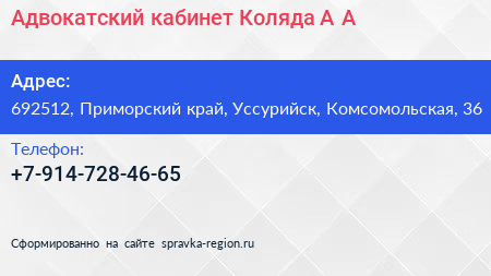 Адвокатский кабинет Коляда А.А. по адресу 692512, Приморский край, Уссурийск, Комсомольская, 36 в дальнейшем Организация, размещена в следующих категориях: