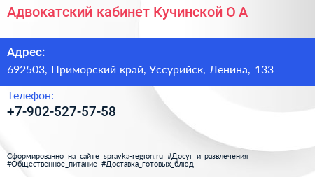 Адвокатский кабинет Кучинской О.А. по адресу 692503, Приморский край, Уссурийск, Ленина, 133 в дальнейшем Организация, размещена в следующих категориях: