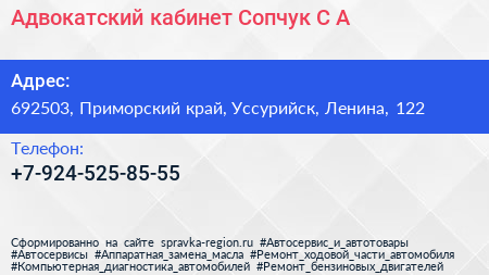 Адвокатский кабинет Сопчук С.А. по адресу 692503, Приморский край, Уссурийск, Ленина, 122 в дальнейшем Организация, размещена в следующих категориях: