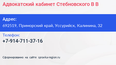 Адвокатский кабинет Стебновского В.В. по адресу 692519, Приморский край, Уссурийск, Калинина, 32 в дальнейшем Организация, размещена в следующих категориях:
